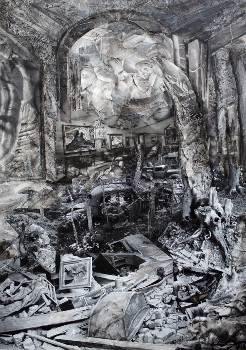 Analoge Collage, Wasserzeichnung, Kohle und Bleistift auf Papier, 107 x 73 cm
