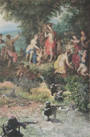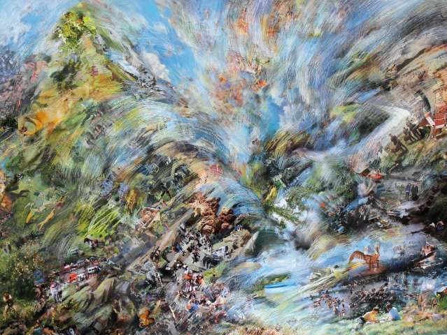 Landscape 6, 2013 Öl und Collage auf Leinwand, 3 integrierte Video-Displays mit Ton, und Objekten 400 x 210 cm, vierteiligLandscapes