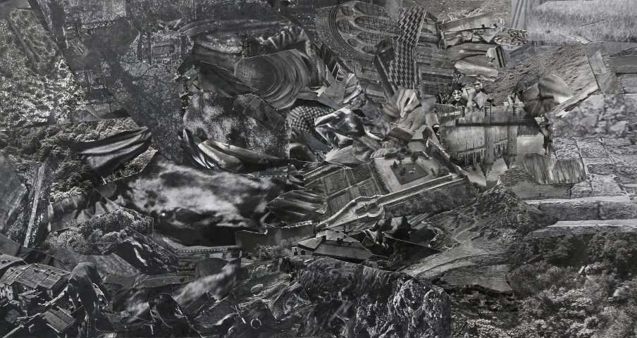 Reflexion of Assemblage 1 and 2, 2024, 2024 Analoge Bilderweiterung von Assemblage 1 und 2 mit KI-generierten Bildfragmenten, Analoge Collage und Kohle auf Papier, 85 x 63 cmAnalog image extensions