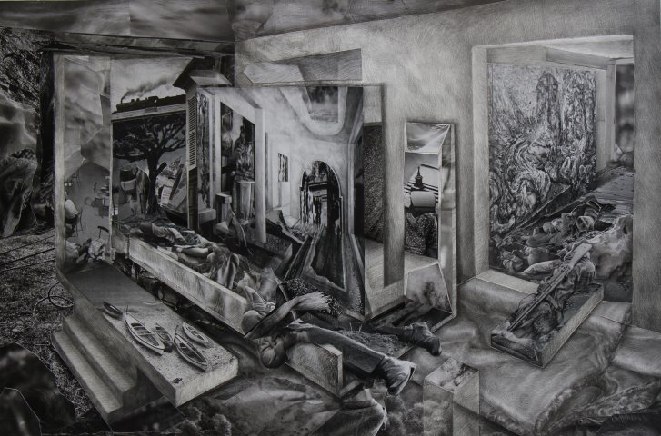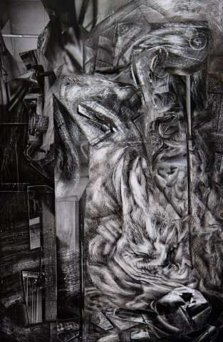 Room 9 (reflexion), 2024 Analoge Collage, Wasserzeichnung, Kohle und Bleistift auf Papier, 185 x 126 cm room reflexions